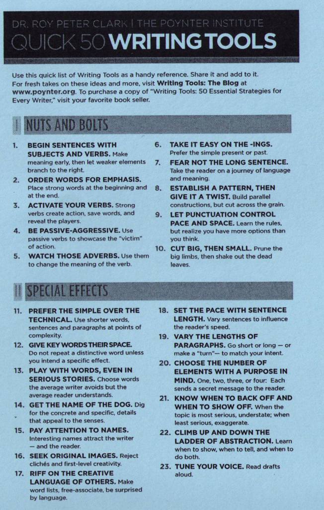 When I taught college English courses and creative writing classes, I came across a book by Roy Peter Clark called Free to Write: A Journalist Teaches Young Writers. It’s out of print now, but this book offered me a treasure trove of writing instruction for my college students. Recently, I found the infographic below and it contains valuable writing style advice from him.
