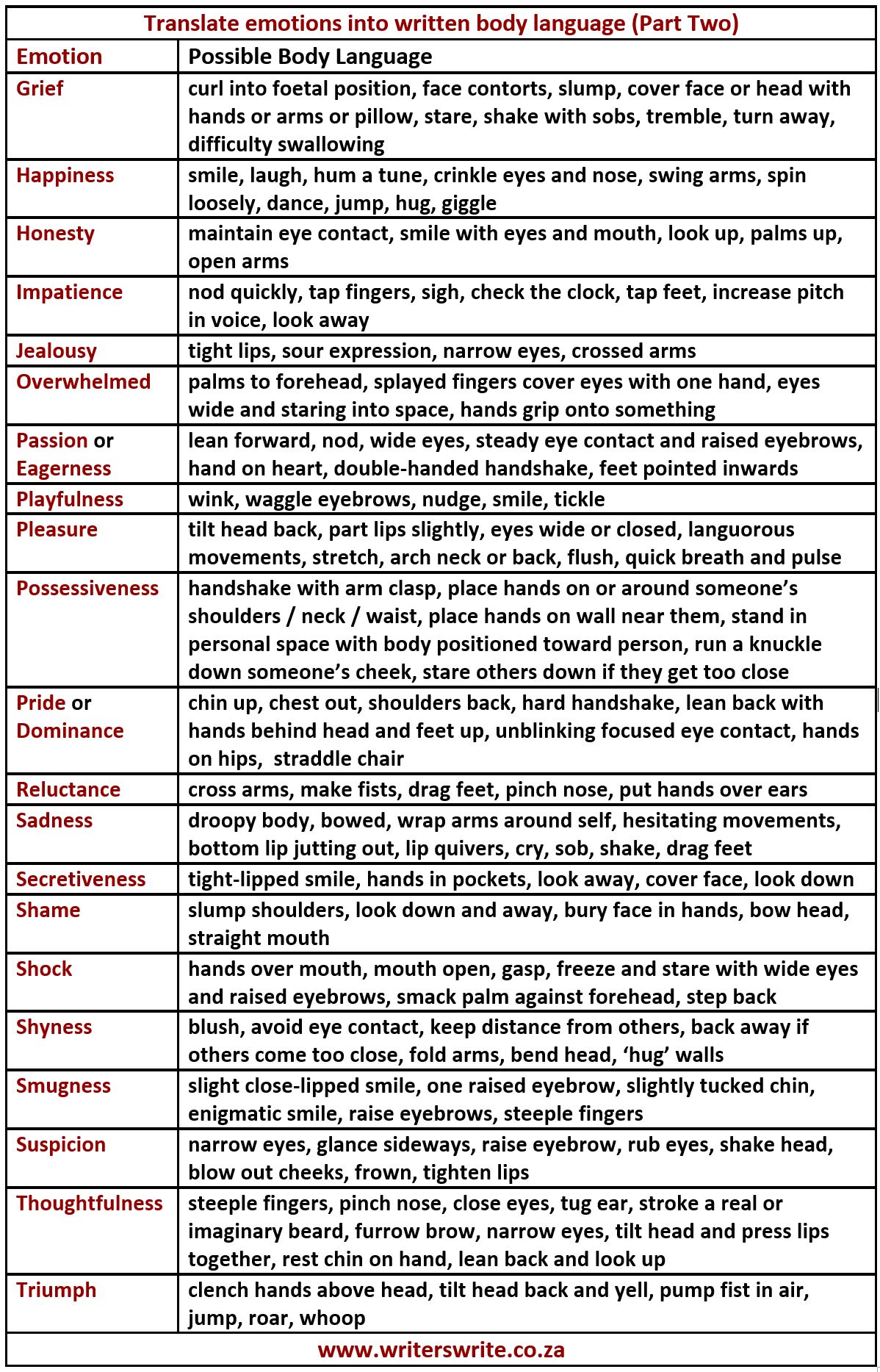 One thing I look for when writing a characters emotions is body language. How does anger translate in a person’s expression, posture and movement? How does shock? How should a writer transcribe what their characters feel into tangible body language?