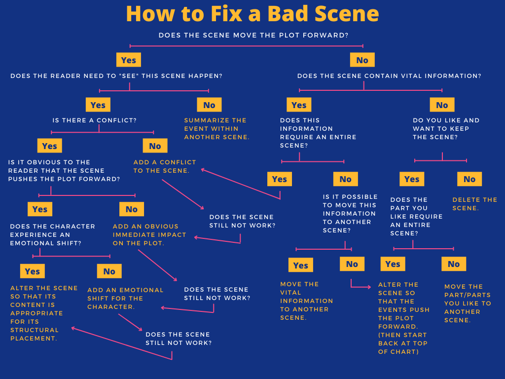 Scenes are the building blocks of fiction writing. I came across this great infographic on evaluating a scene’s worthiness. Editor Ellen Brock created this wonderful chart and talks about it in this video. Check out her YouTube and her website for more great writing advice.