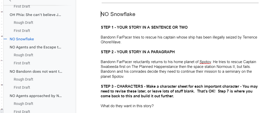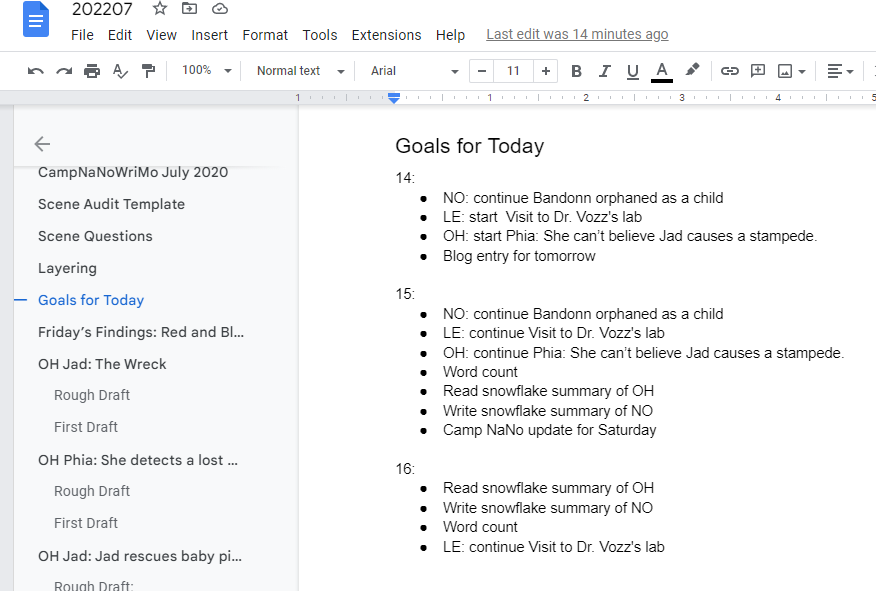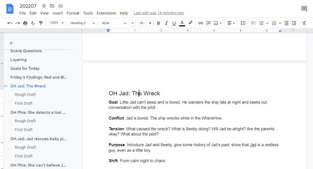 - For each writing session, give it a title. I use the scene’s working title, blog entry title. Then I use a headline text style on that title. On the left of the document, a list of each scene appears and you can use the list to navigate around the scratchpad document. This is helpful for when you want to come back the next day and continue working on a scene.