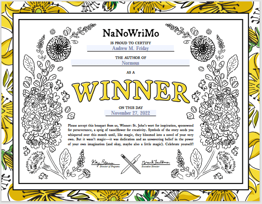 I wrote the last 2800 words yesterday and reach 50K. I won NaNoWriMo 2022!