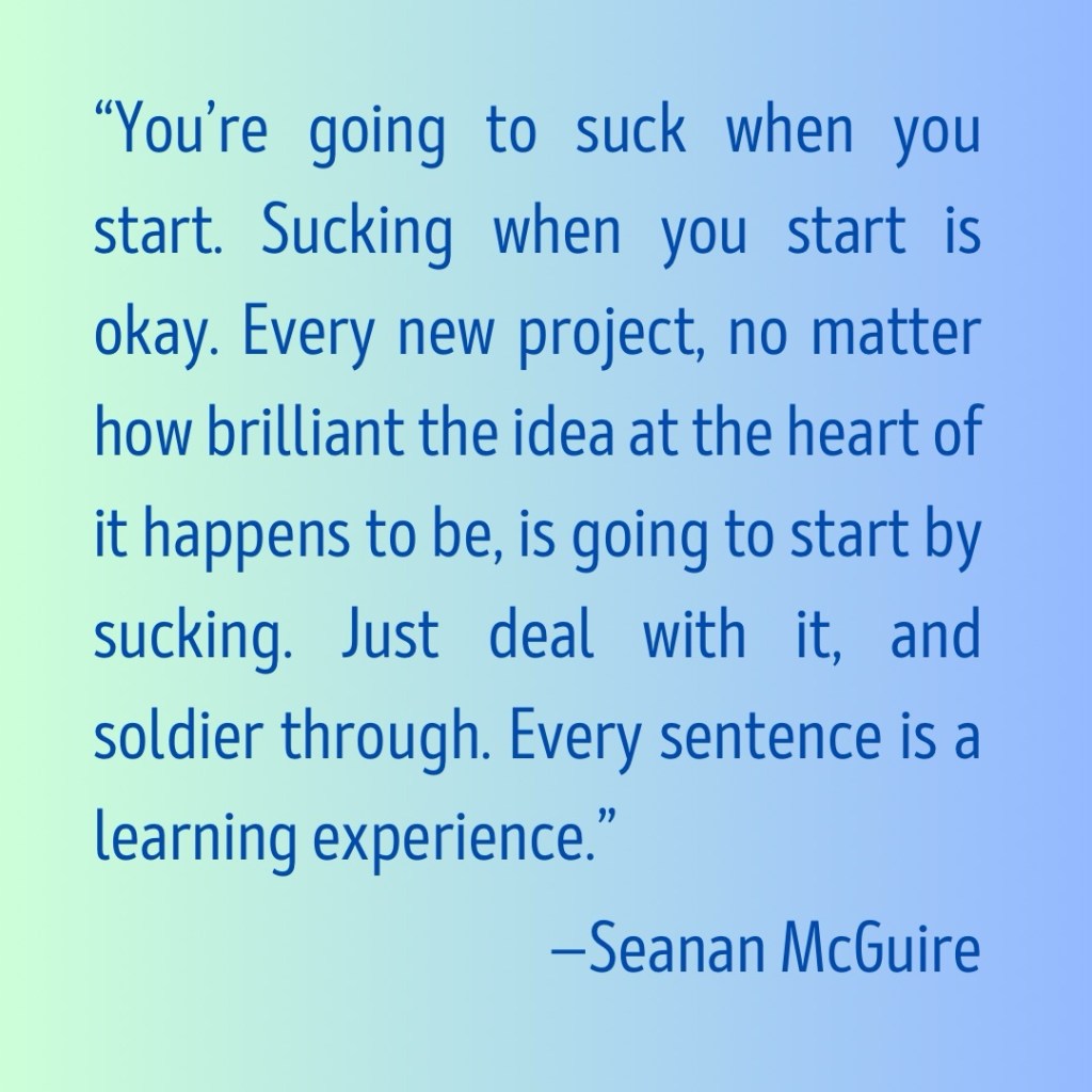 “You’re going to suck when you start. Sucking when you start is okay. Every new project, no matter how brilliant the idea at the heart of it happens to be, is going to start by sucking. Just deal with it, and soldier through. Every sentence is a learning experience.” -Seanan McGuire