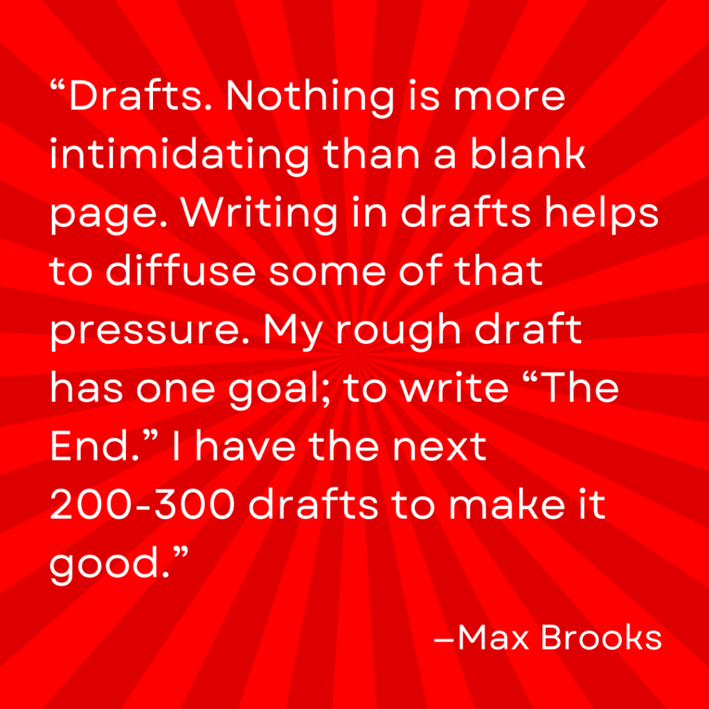 “Drafts. Nothing is more intimidating than a blank page. Writing in drafts helps to diffuse some of that pressure. My rough draft has one goal; to write “The End.” I have the next 200-300 drafts to make it good.” -Max Brooks