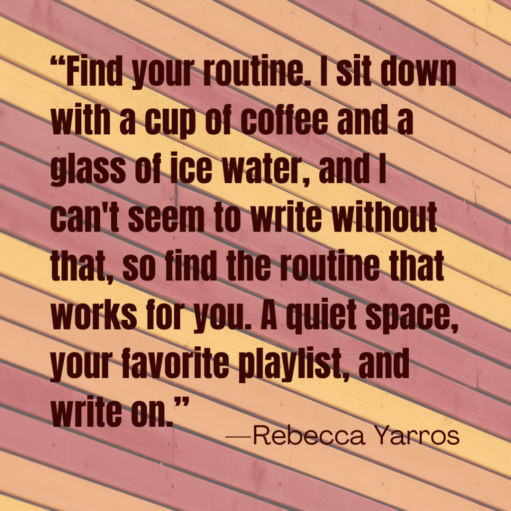 “Find your routine. I sit down with a cup of coffee and a glass of ice water, and I can’t seem to write without that, so find the routine that works for you. A quiet space, your favorite playlist, and write on.”